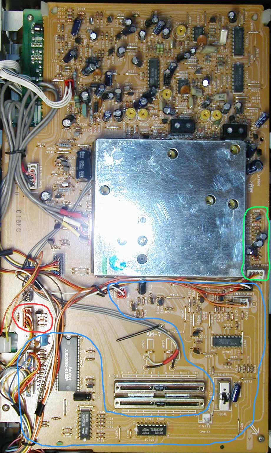 - Der Rekorder spult am Bandende nicht mehr automatisch zurück. Wenn man das gerne wieder hätte, einfach den Stecker CN706 auf der AM-7 ziehen; damit ist auch EJECT an der Fernbedienungsbuchse abgeschaltet. Wenn das weiter funktionieren soll, den Widerstand R750 einseitig auslöten und CN706 nicht ziehen (rot).