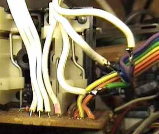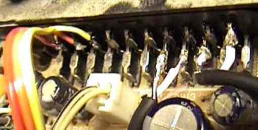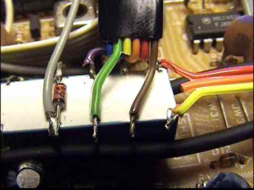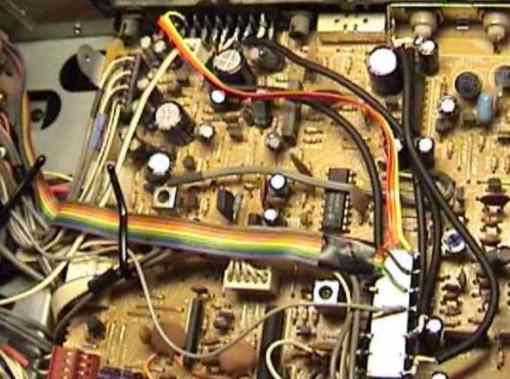Jezt wird die Audio-Cinchbuchsen-Platine ausgebaut. Dort sind Pin 6, 5 und 7 der Steckerleitung auszulöten. Nun benötigen wir eine 7-adriges Flachbandkabel, das wie folgt verlötet wird: