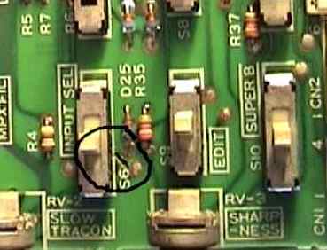 Der Rekorder ist zu zerlegen und die Abdeckung vom Bedienteil abzunehmen. Die Leiterbahn ist an der markierten Stelle zu durchtrennen (der Rekorder schaltet bei "SIMUL"; jetztauf Line; die Anzeigen auf dem Display bleiben unverändert).
