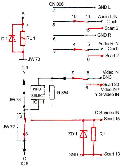 Nun verdrahten wir das Relais RL1: Dieses zieht nur bei richtiger Polung der Versorgungsspannung an. Am besten mal ausprobieren. Dannach löten wir die Diode D1 mit der Kathode an die Plusseite und die Anode an die Minusseite. Dabei kann man gleich die Leitung vom Bedienteil (A) und die Leitung nach Masse JW73 anlöten. Nun die 3-adrige Flachbandleitung von der Scartbuchse ablängen, und den mittleren Draht (orange) ca. 1cm kürzen. Danach folgende Lötverbindungen herstellen: