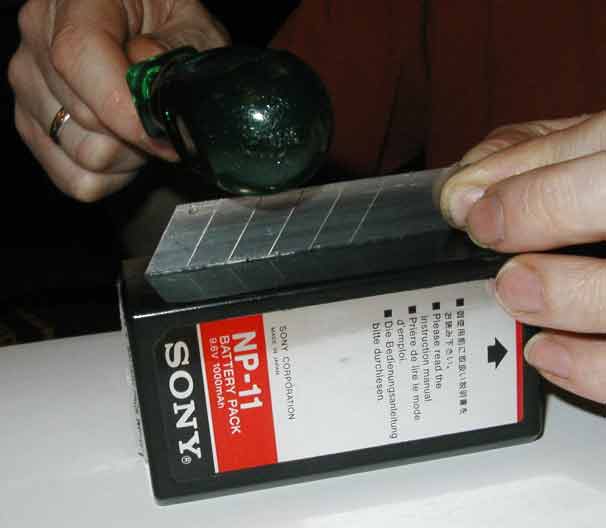 Oben sieht man das Innenleben des originalen NP-11-Akkus. Dieser besteht aus 8 Stück 4/5 Sub-C-Zellen NiCd (Ø 23mm * h 33mm) mit einer Kapazität von 1000mAh und einer Temperatursicherung (zwischen den linken 4 Zellen). Will man den Akku neu befüllen, besorgt man sich die passenden (schnelladefähigen) Akkuzellen. Danach zerlegt man den Originalakku. Das geht am besten, indem man eine Abbrechklinge in den seitlichen Gehäusespalt steckt und mit einem Schraubenzieher draufhaut, siehe Bild. Das wiederholt man vorsichtig an allen vier Seiten bis das Gehäuse aufbricht. Nun baut man die neuen Zellen mit der Temperatursicherung genauso ein, wie es im Original war. Auf keinen Fall darf man die Temperatursicherung weglassen! Sie ist für die Sicherheit sehr wichtig, denn ohne ihn könnte der Akku explodieren. Nachdem man den Akku geprüft hat, kann man ihn wieder zusammenkleben.