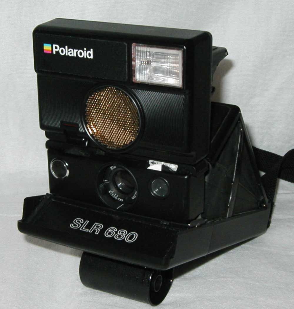 Die SLR680, sozusagen fast das Endstadium der SX-70, ca. 1985: Sie ist eine SX-70 SONAR mit Blitz und nutzt den ca. 4x lichtempfinlichen Film 600.