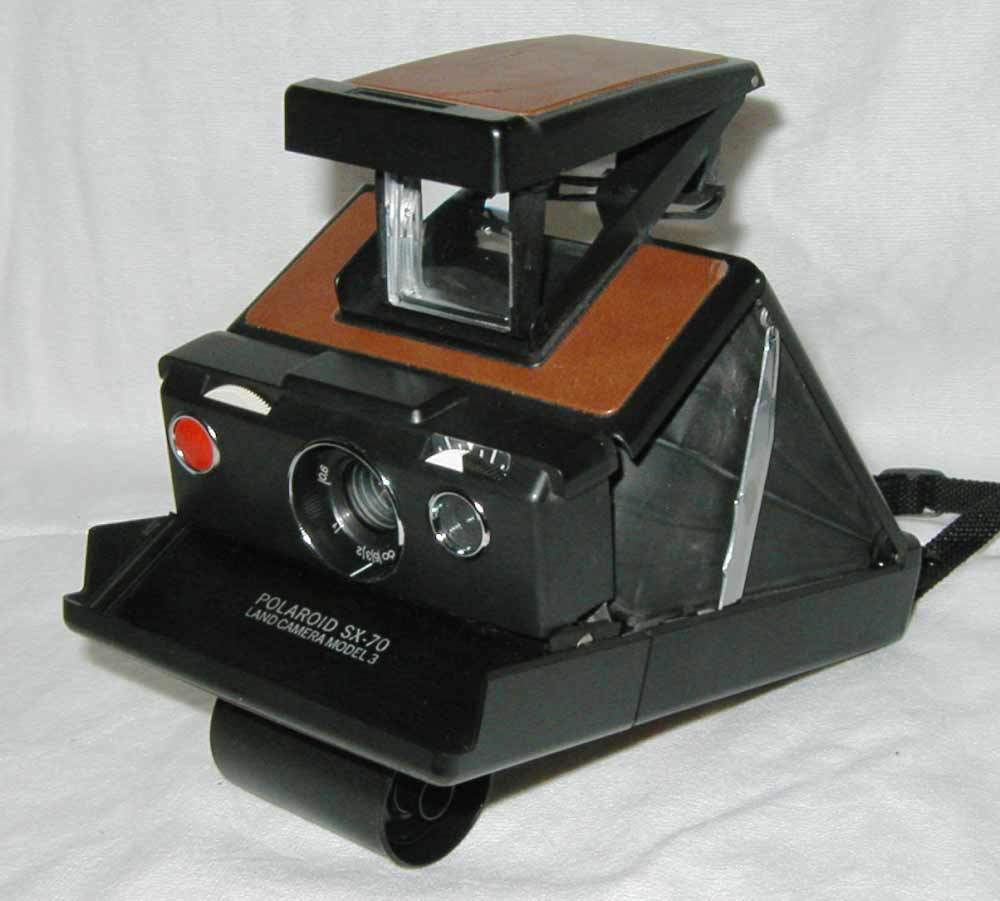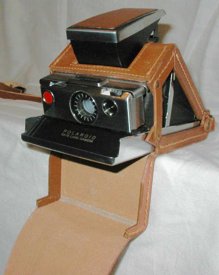 Eine abgespeckte SX-70 ALPHA 1 von 1977. Sie hat einen Sucher und ist keine Spiegelreflexkamera. Interessanterweise hat sie die gleiche Klappspigelmechanik wie die Spiegelrefelx SX-70. Der Steckplatz für die Blitzleiste befindet sich auf der Sucherabdeckung. Sie hat Halterungen für einen Tragegurt und kein Stativgeweinde.