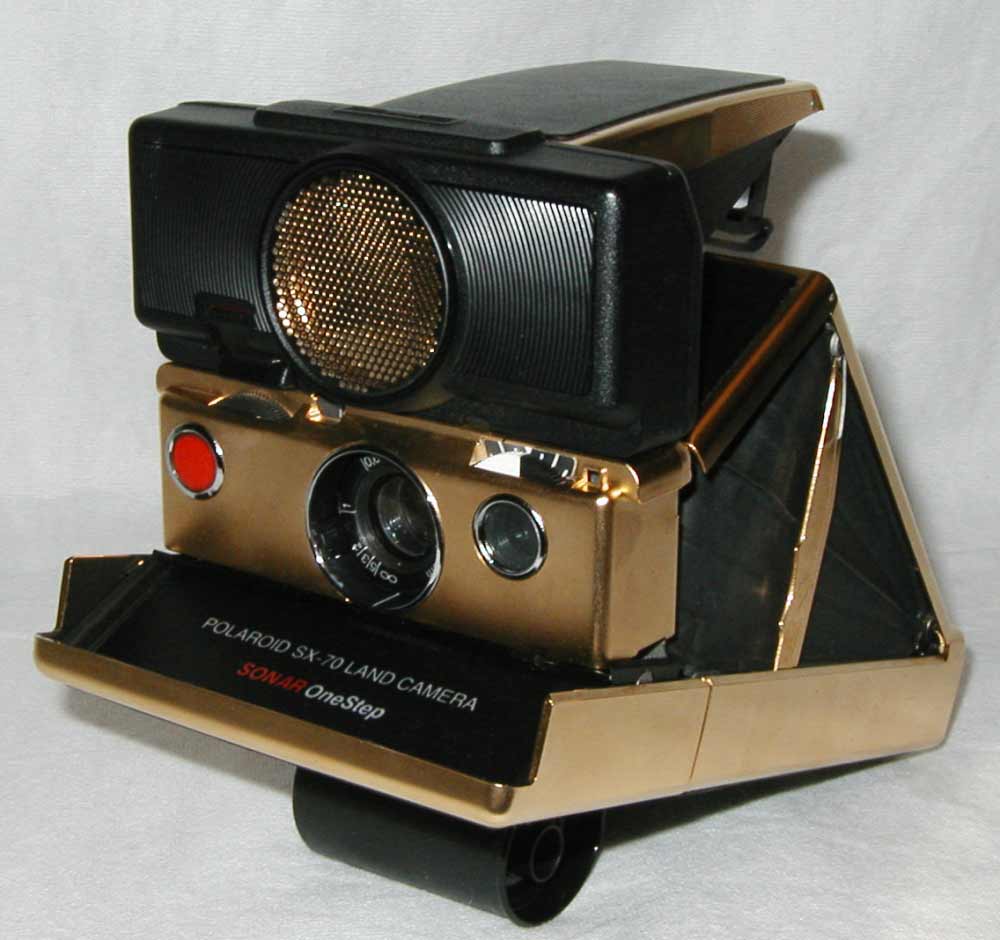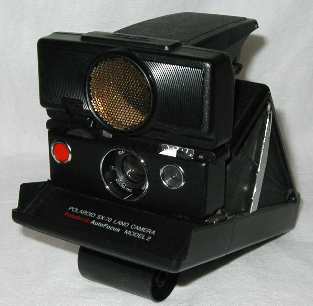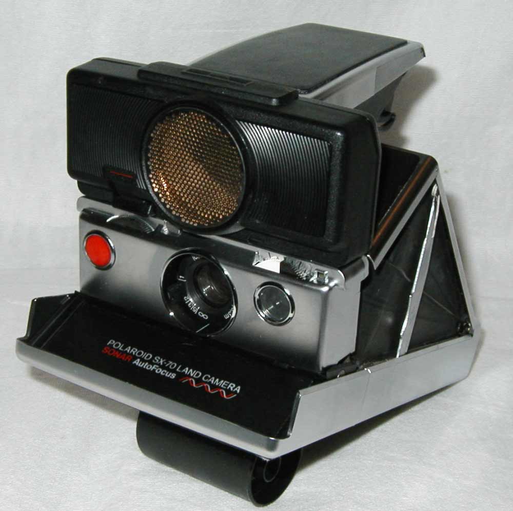 Eine der ersten SX-70 SONAR Autofocus Kamera von 1978: Die Kamera hat einen Ultraschallentfernungsmesser bekommen, dafür aber keine Schnittbildsucher mehr. Damit ist sie zusamengefaltet zwar estwas größer, aber es entfällt das langwierige Scharfstellen. Durch die Ultraschalltechnik funktioniert der Autofocus auch bei völliger Dunkelheit, scheitert dafür aber an Glasscheiben. Dafür kann man den Autofocus auch abschalten. Tippt man den Auslöser leicht an, stellt der Autofokus sehr schnell scharf. So kann man sich ein Bild machen, bevor man eins macht. Zusätzlich bekommt man mit einer Anzeige im Sucher angezeigt, wenn das Licht nicht reicht.