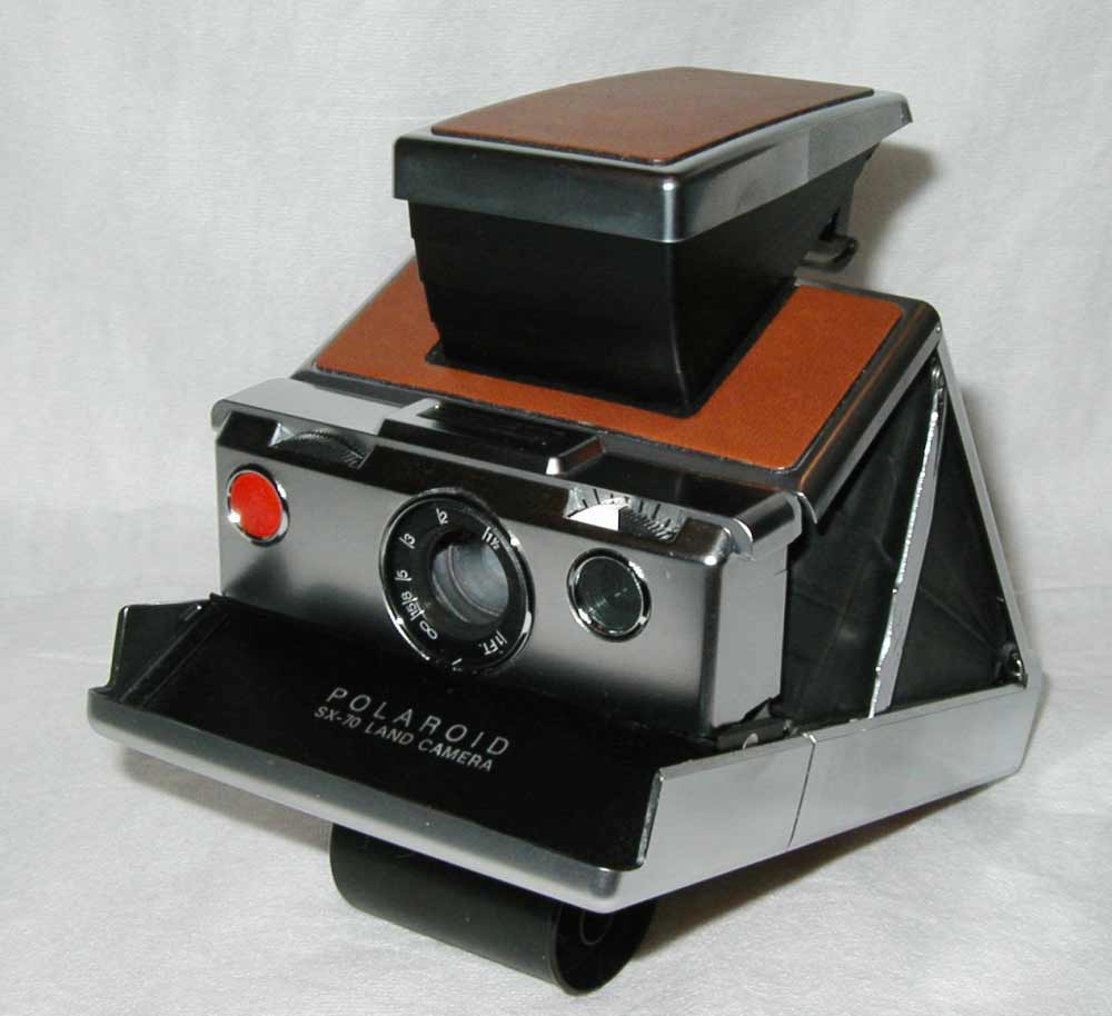 Fast die Ur-Version der Spiegelreflex SX-70 von 1974: Sie hat schon einen Schnittbildsucher aber noch keine Entfernungsangaben auf der Linse. Gebürstetes Metallgehäuse lock und Metallverschlußgehäuse.